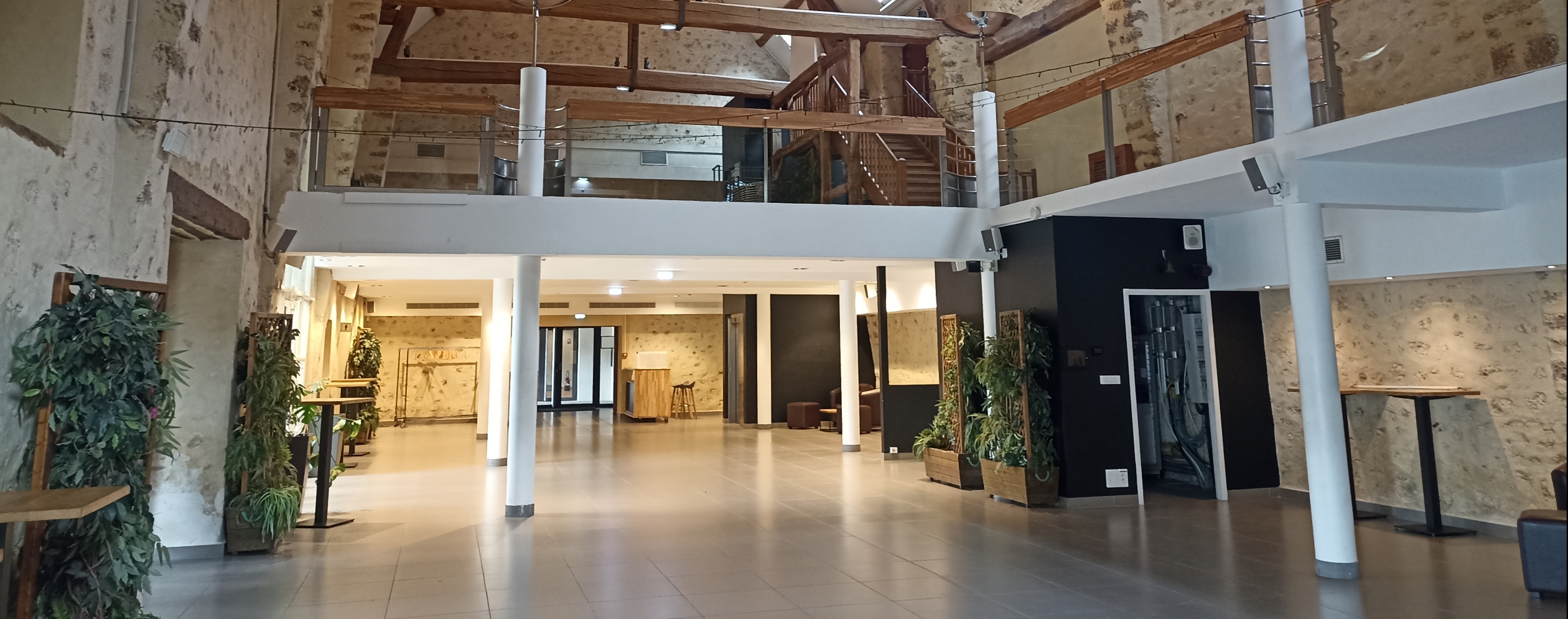 Le Hall est un espace spacieux et élégant, surmonté d'une magnifique charpente qui ajoute une touche de grandeur à l'atmosphère générale.